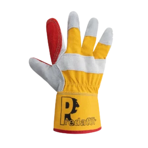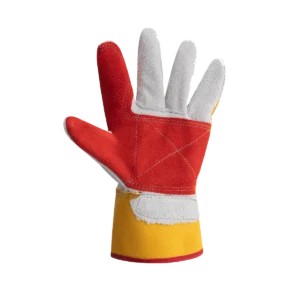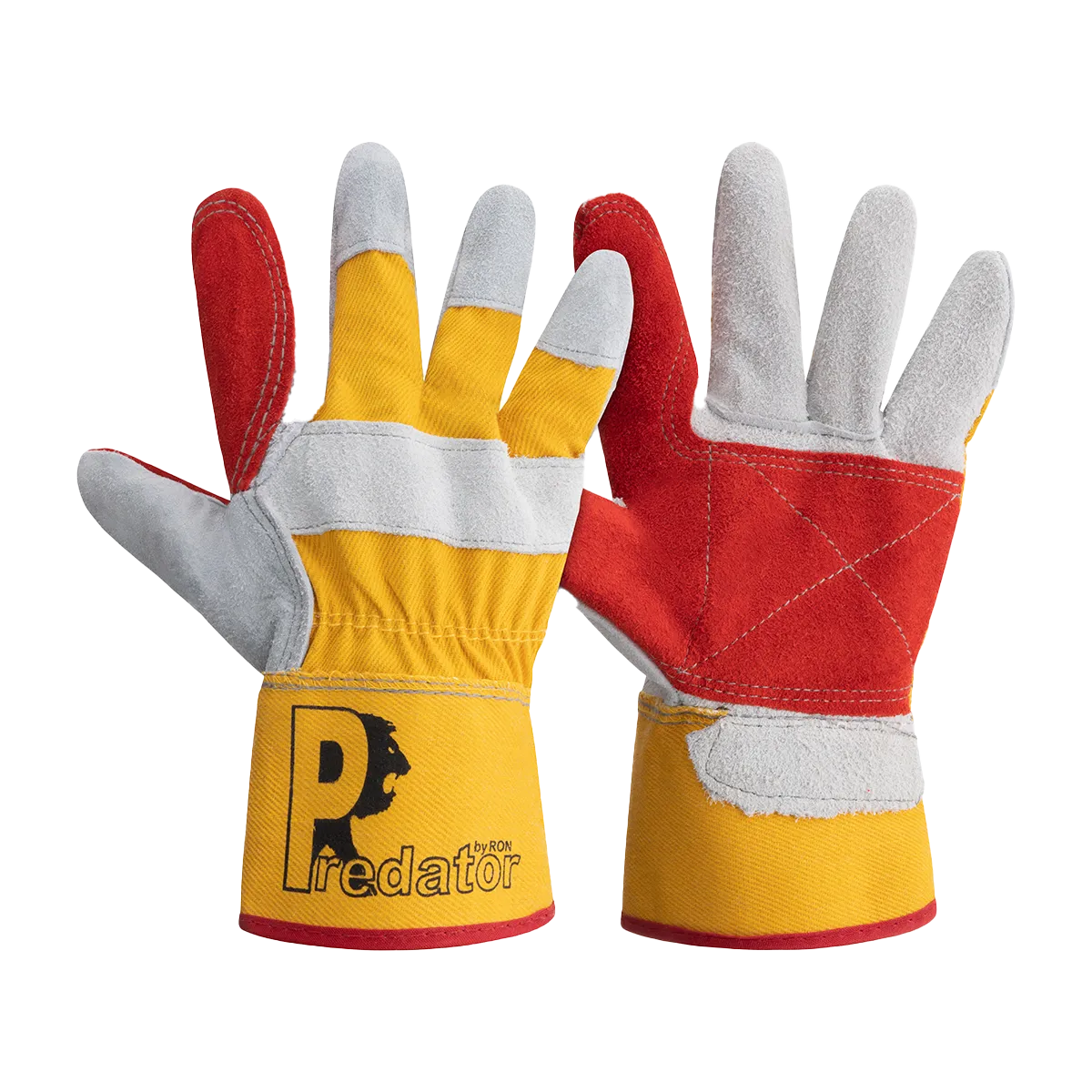 The Power Plus Double Palm Rigger is a heavy-duty safety glove constructed from top-quality split leather, featuring a reinforced double-layer palm and a specialized wrap-around index finger for superior protection in demanding environments.