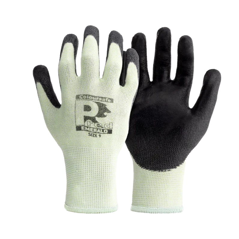 The Pred Emerald is a premium safety glove designed to offer a balance of high cut resistance and exceptional dexterity. It features a lightweight 13-gauge green Azura and polyester breathable liner, palm-coated with high-quality polyurethane (PU). This combination provides a comfortable “second-skin” fit while ensuring Cut Level C protection, making it ideal for precision tasks in various industrial sectors.